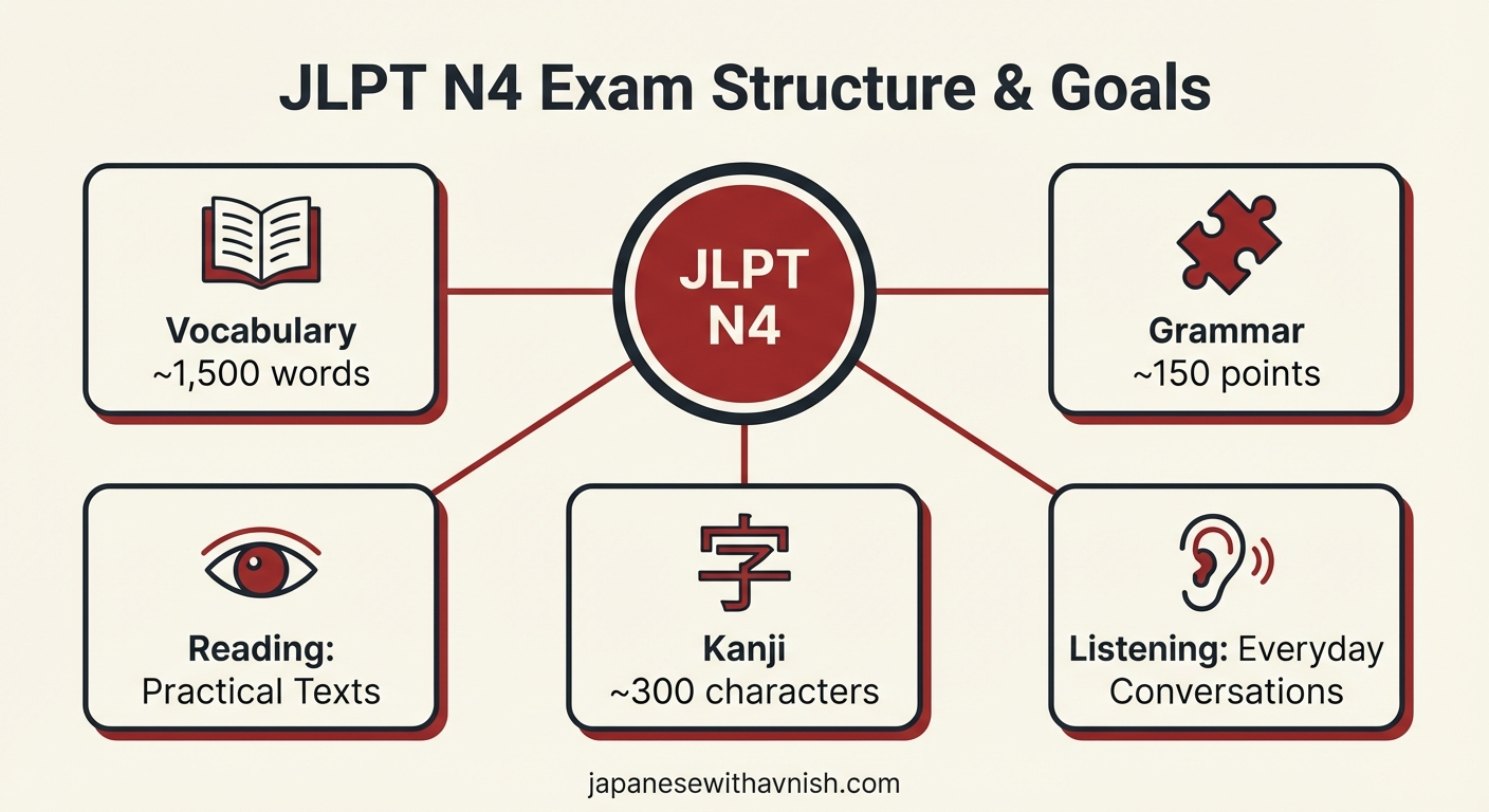 A structured, step-by-step guide for JLPT N4 learners. Covers exam format, grammar, vocabulary, kanji, a 4-month study schedule, and test strategies for success.