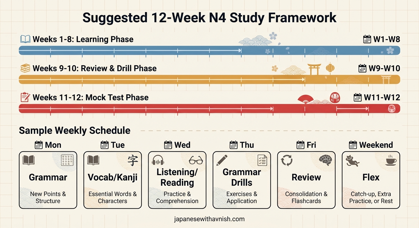 - Weeks 1-8 (Learning Phase): Dedicate days to different skills. Example: Monday-Grammar (Core Textbook), Tuesday-Vocab/Kanji, Wednesday-Listening/Reading, Thursday-Grammar Drills, Friday-Review. Use weekends for catch-up or preview.