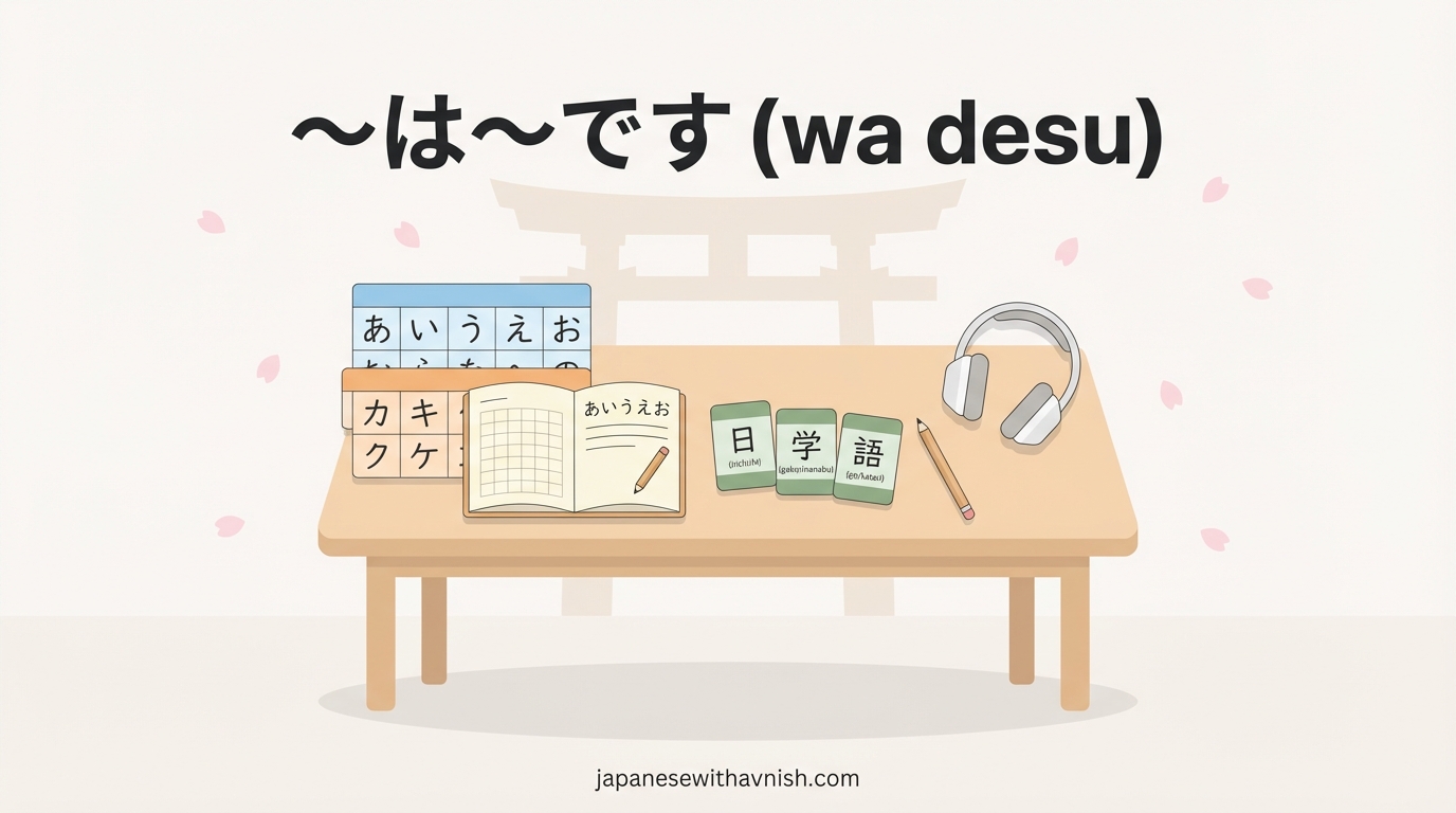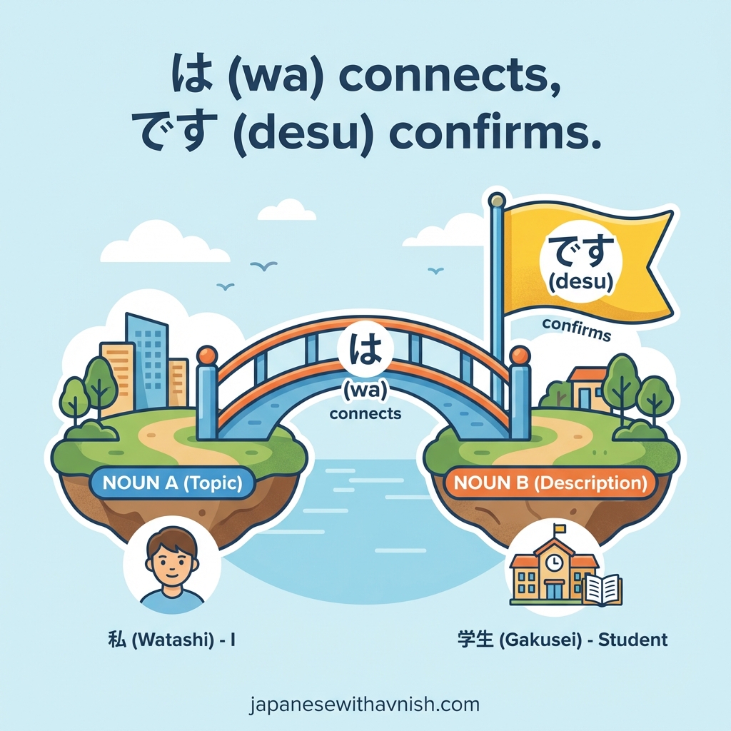- Imagine "wa" (は) as a peace symbol linking two ideas together, stating they are connected. Visualize a bridge (は) connecting two islands (nouns), with "desu" (です) as the flag on the other side, confirming the connection.