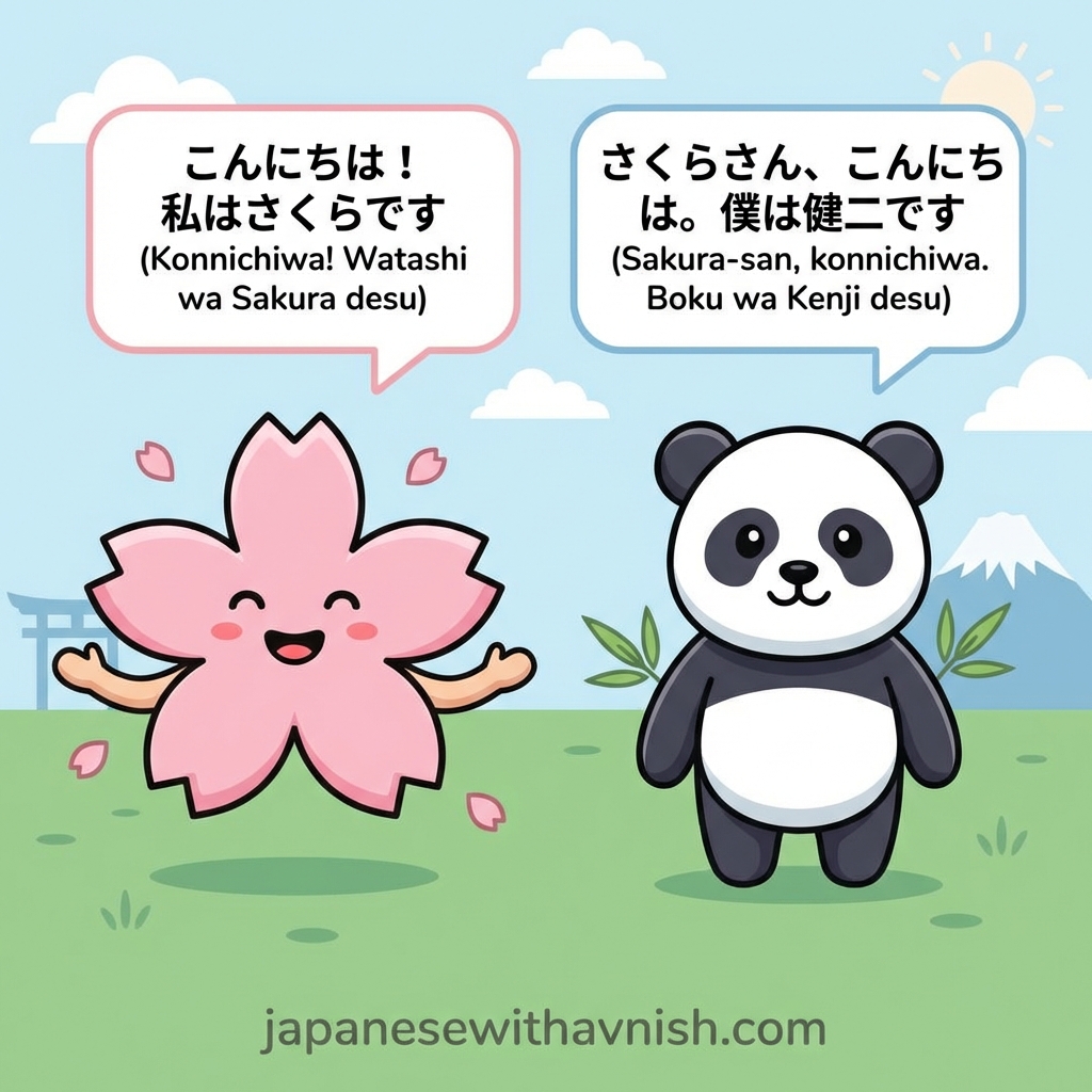 Romaji: Sakura-san, konnichiwa. Boku wa Kenji desu.