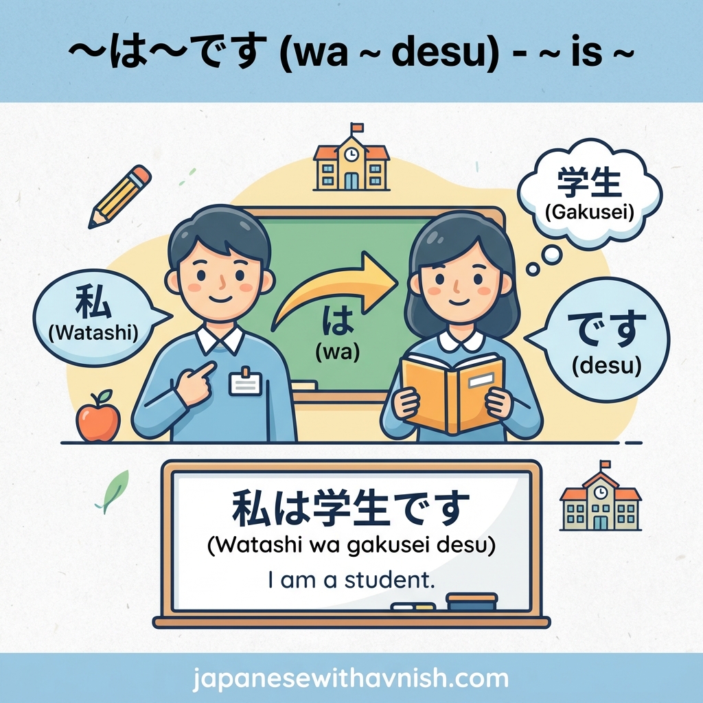 - Example: 私は学生です (Watashi wa gakusei desu. I am a student.)