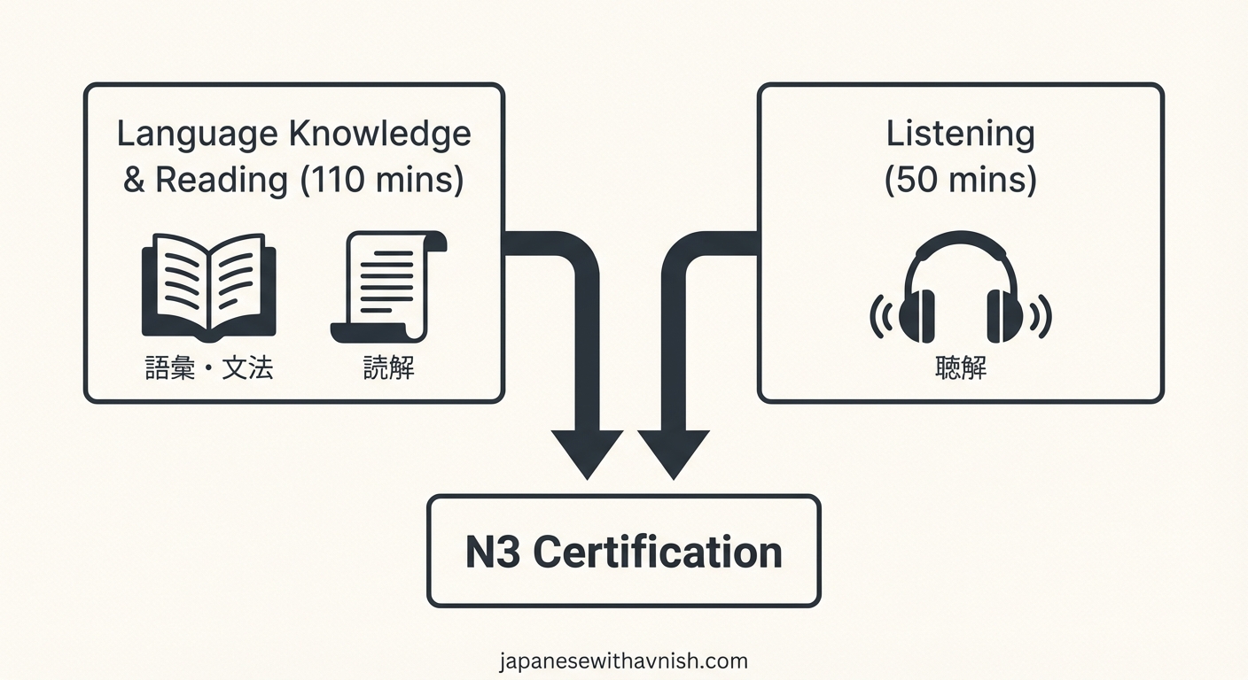 A clear understanding of the test format is the first step in any successful preparation. The JLPT N3 is divided into three sections, with a total test time of 140 minutes. Unlike N5 and N4, the sections are more integrated, testing your ability to apply knowledge in context.
