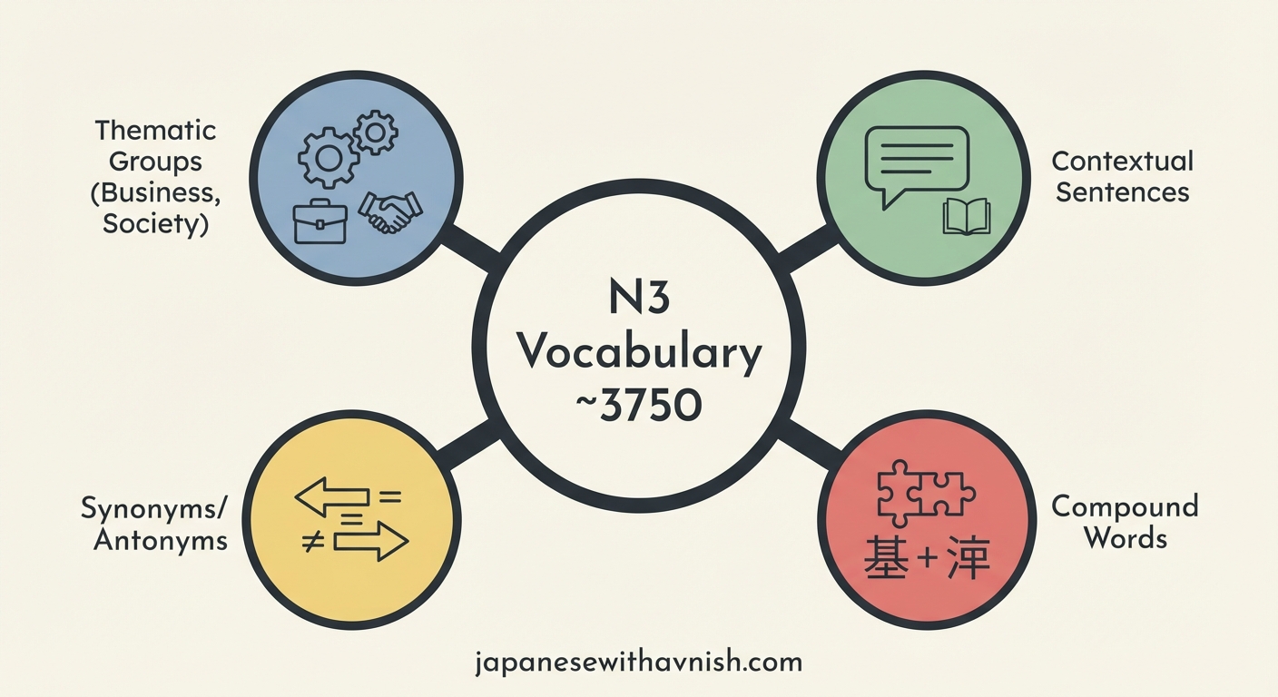 The N3 requires knowledge of approximately 3,750 vocabulary items (building upon the ~1,500 from N5/N4). Focus shifts from purely survival vocabulary to words used in news, articles, and everyday discussions.