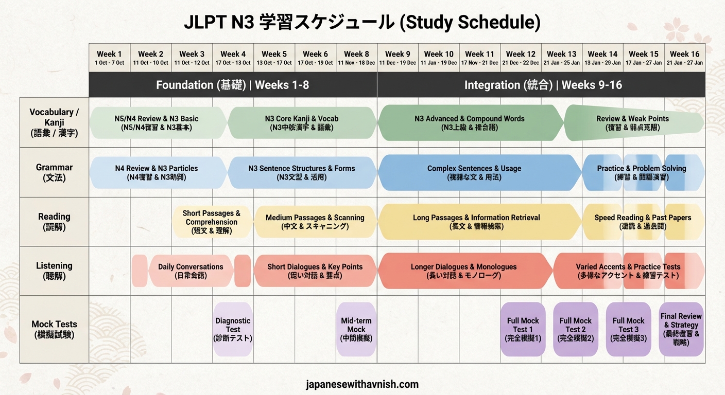 - Weeks 1-4: Review key N4 grammar and vocabulary. Begin learning 20 new N3 vocabulary words and 10 new kanji daily.
