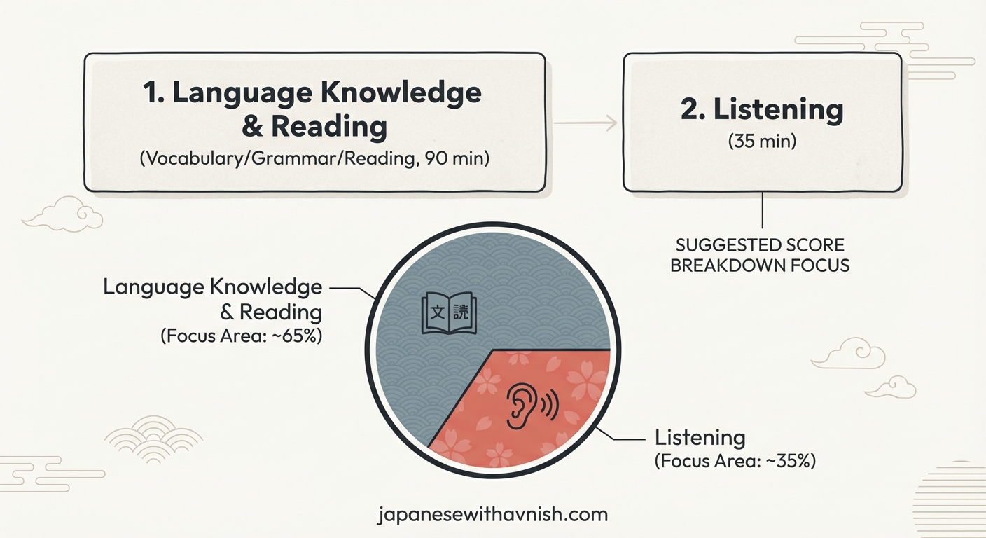 Language Knowledge (Vocabulary & Grammar) & Reading (30 minutes + 60 minutes): This combined section is 90 minutes long. The first part tests vocabulary through word reading, orthography (correct character usage), and contextually-defined expressions. The second part covers grammar with sentence formation and text grammar questions. The reading comprehension section follows, requiring you to understand short passages on daily topics.