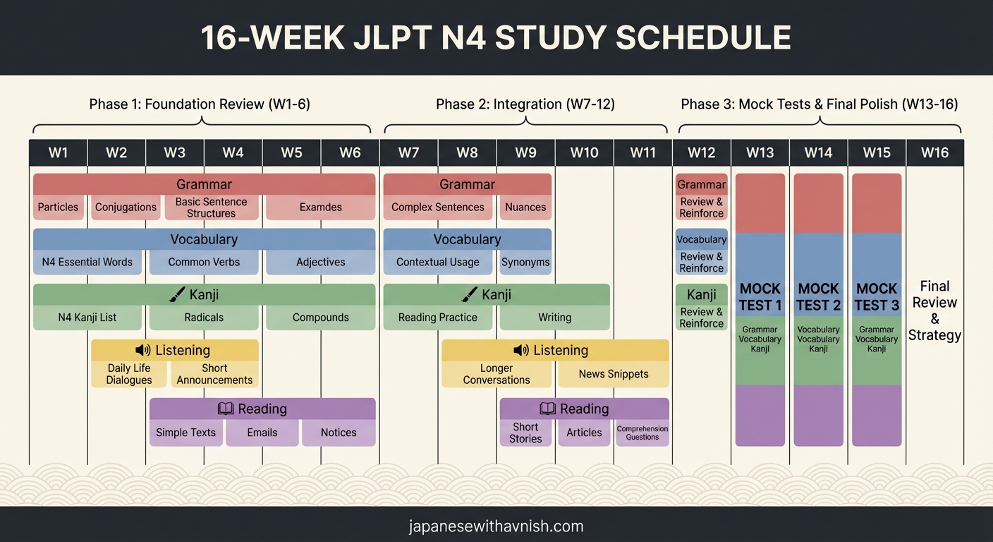 - Daily (1 hour): Review N5 kanji (15 mins). Learn 5 new N4 kanji and 15 new vocabulary words. Study 3-4 new grammar points.