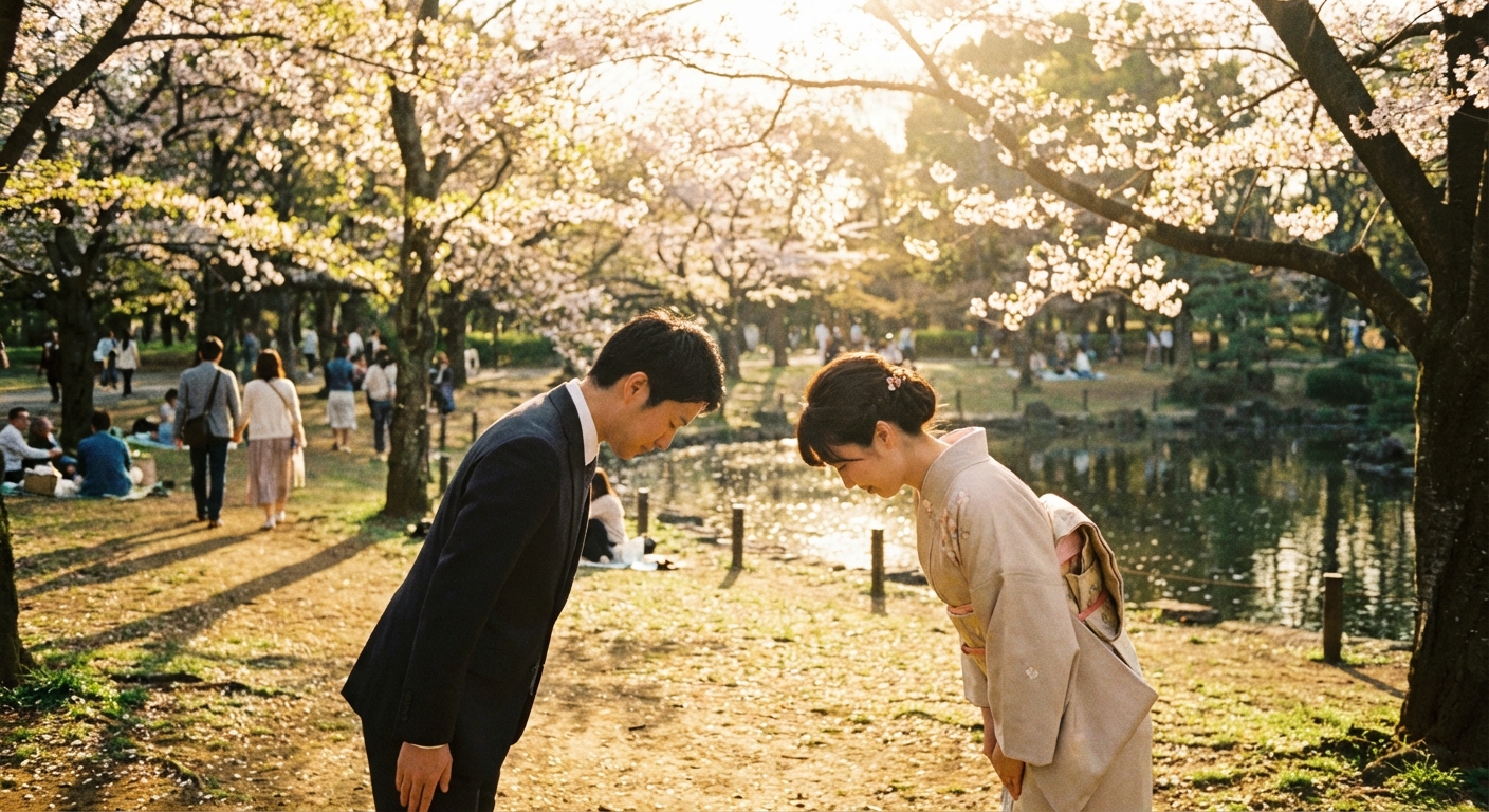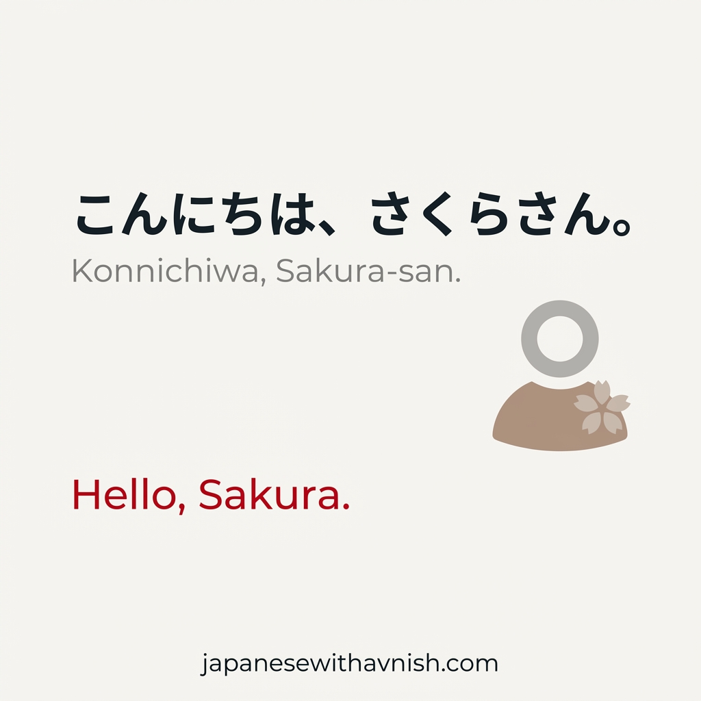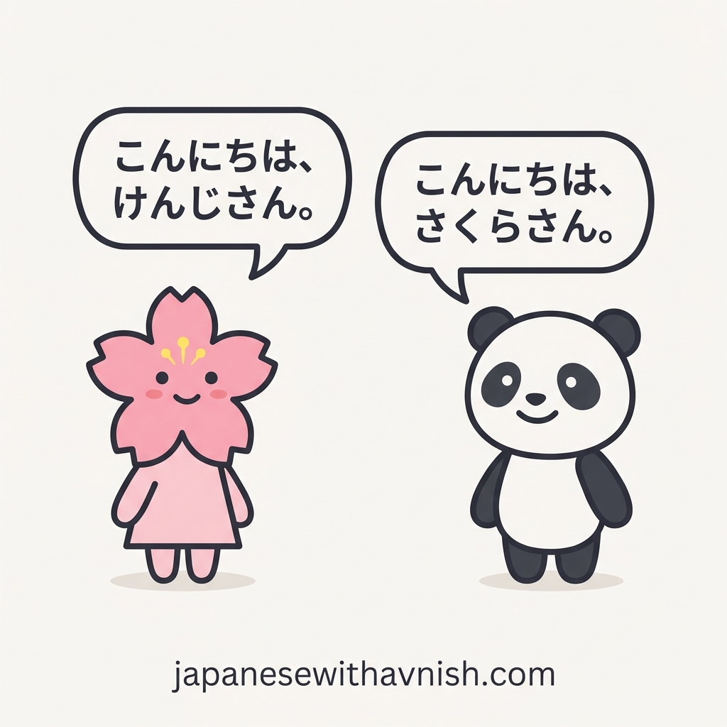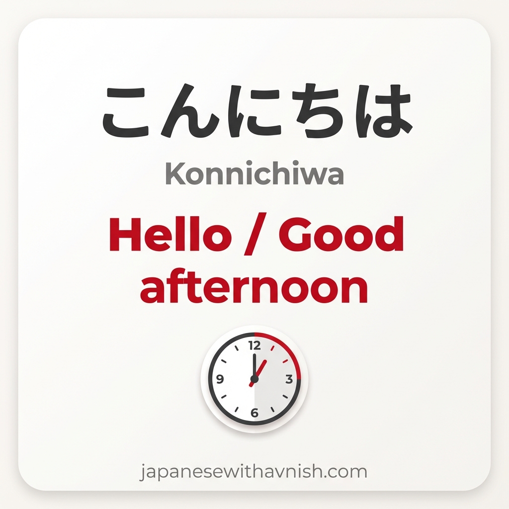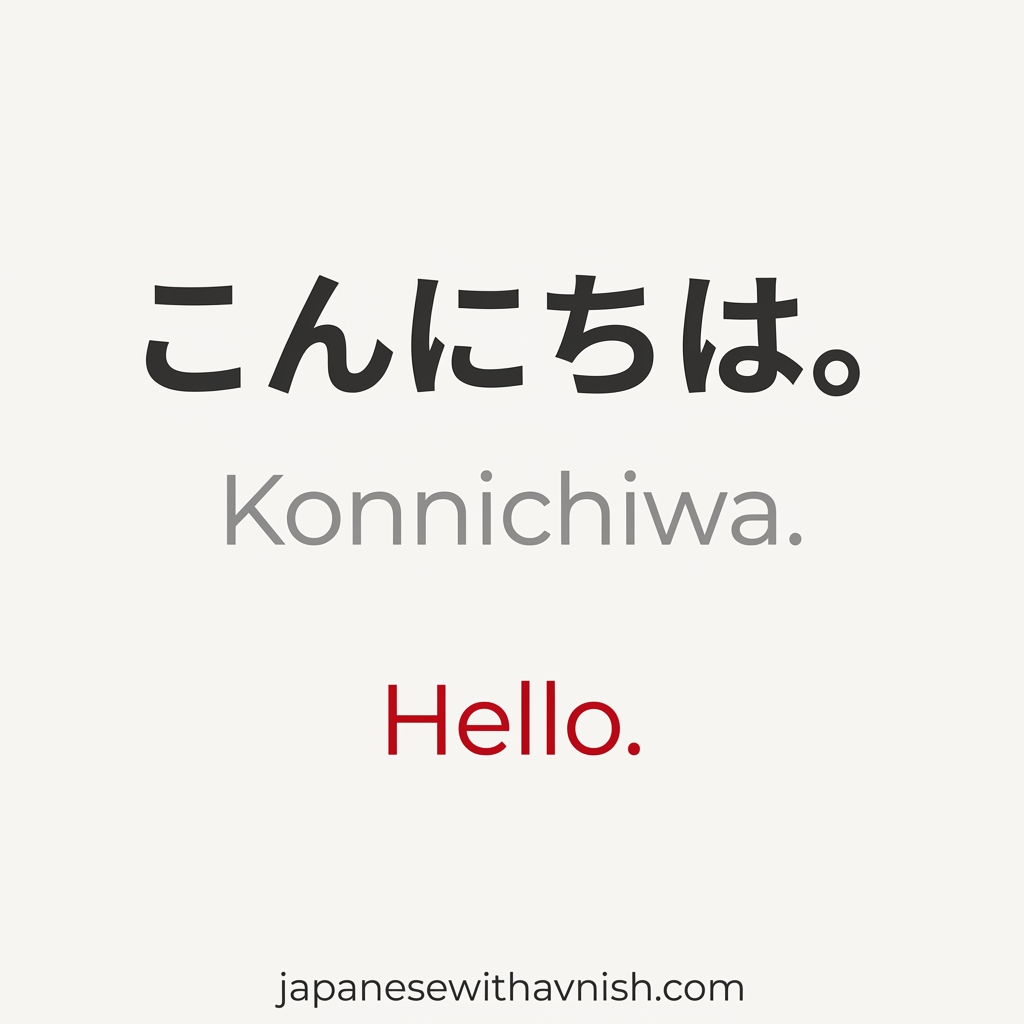 ✔ Correct (Japanese): こんにちは - The greeting is written with the character は (ha) but pronounced 'wa'. This is a historical grammatical particle that became a fixed part of the greeting.