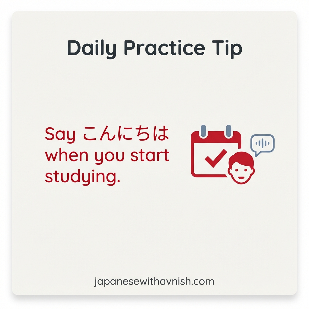 - Practice saying こんにちは out loud every day when you start your Japanese study session to build muscle memory for the correct pronunciation.